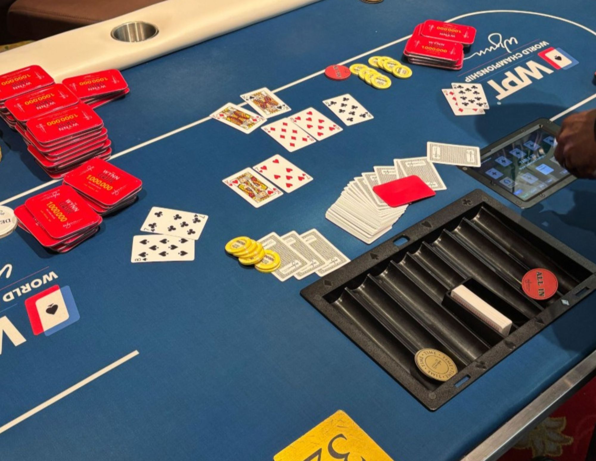 Com apenas três jogadores na mesa final, Sklenicka dominava em fichas com cerca de 60 milhões — quatro vezes mais do que a soma dos stacks de seus dois adversários. No botão, o tcheco foi all-in com 8♦7♠. No small blind, Jun Obara encontrou K♠K♥ e deu call com seu stack de pouco menos de 10 milhões. Já no big blind, Daniel Rezaei analisou seu 10♣10♠ e também pagou com seus últimos cinco milhões.