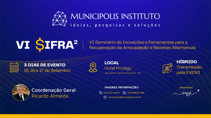 O evento é promovido pelo Municipolis Instituto, fundado por Ricardo Almeida, procurador do Município do Rio de Janeiro e assessor jurídico da Associação Brasileira das Secretarias de Finanças das Capitais (Abrasf). O seminário tem como propósito discutir ferramentas inovadoras para ampliar a arrecadação dos municípios e explorar alternativas de receitas que ajudem no equilíbrio fiscal.